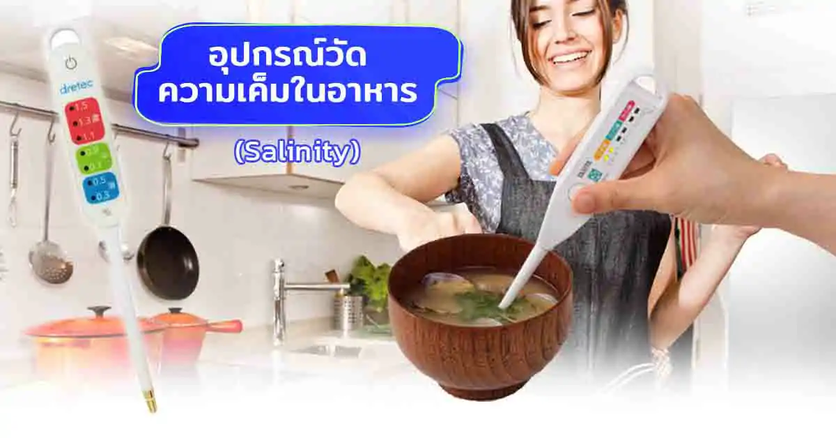 อุปกรณ์วัดความเค็มในอาหาร (Salinity Meter) ใช้สำหรับตรวจวัดความเข้มข้นของเกลือที่ละลายในน้ำหรืออาหาร โดยอาศัยหลักการวัดค่าการนำไฟฟ้า (EC) ซึ่งน้ำที่มีเกลือละลายจะนำไฟฟ้าได้ดีกว่าน้ำจืด เครื่องวัดความเค็มจึงช่วยประเมินปริมาณโซเดียมในอาหารได้อย่างแม่นยำ เหมาะสำหรับผู้ที่ต้องควบคุมปริมาณเกลือ เช่น ผู้ป่วยความดันโลหิตสูงหรือโรคไต รวมถึงนักกีฬาและผู้ที่ต้องการดูแลสุขภาพ การใช้อุปกรณ์นี้ช่วยให้ควบคุมการบริโภคโซเดียมได้เหมาะสม ป้องกันความเสี่ยงต่อโรคที่เกี่ยวข้องกับโภชนาการ
